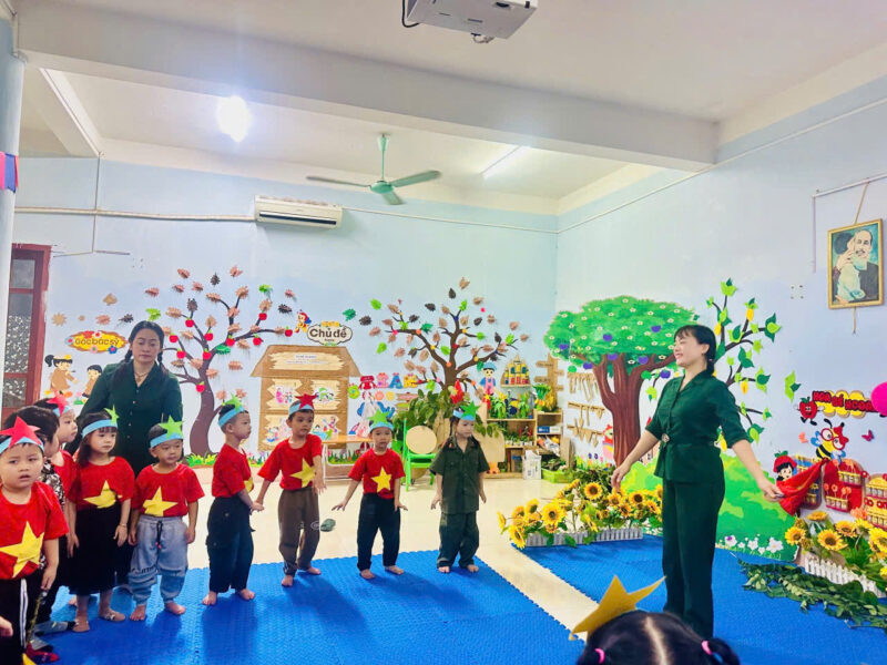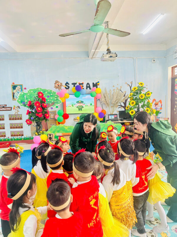 Trong các giờ học, giáo viên đã khéo léo tích hợp nội dung giáo dục truyền thống yêu nước, lòng biết ơn và niềm tự hào dân tộc cho trẻ thông qua các hoạt động thể dục thể thao nâng cao sức khỏe làm quen văn học, âm nhạc, tạo hình, khám phá xã hội… Trẻ được đóng vai chú bộ đội, được nghe kể những câu chuyện giản dị, được hát những bài ca quen thuộc ca ngợi về chú bộ đội dũng cảm giữ gìn hòa bình, bảo vệ Đất Nước, được vẽ tranh, làm bưu thiếp tặng chú bộ đội… trong không khí vui tươi, hồn nhiên nhưng giàu tính giáo dục…